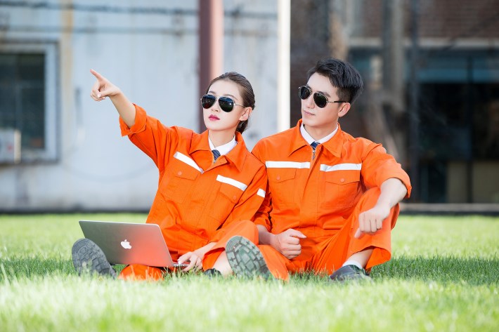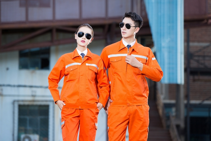 合肥廬江縣工作服定做款式廠家推薦橘黃色工程服環衛勞保服GZ-8009