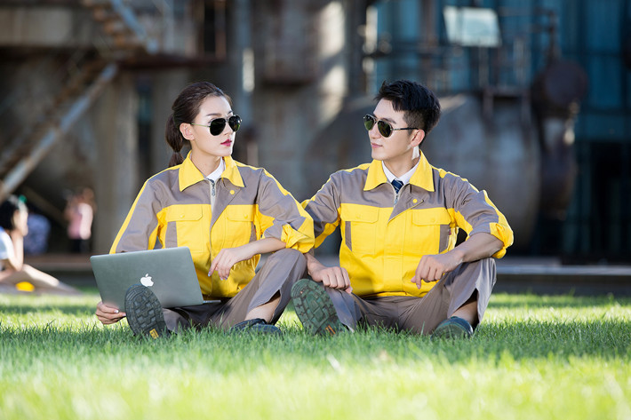 全棉紗卡黃色拼灰色拉鏈式工作服長袖套裝GZ-8018