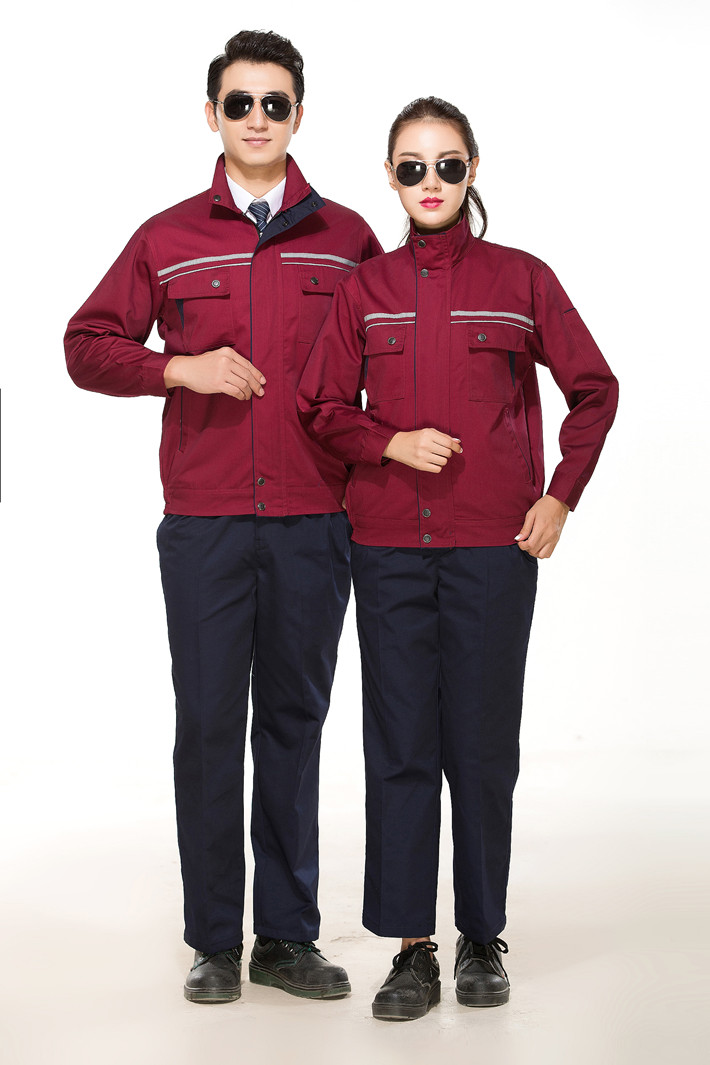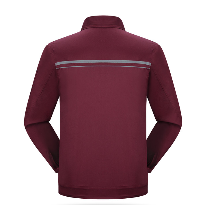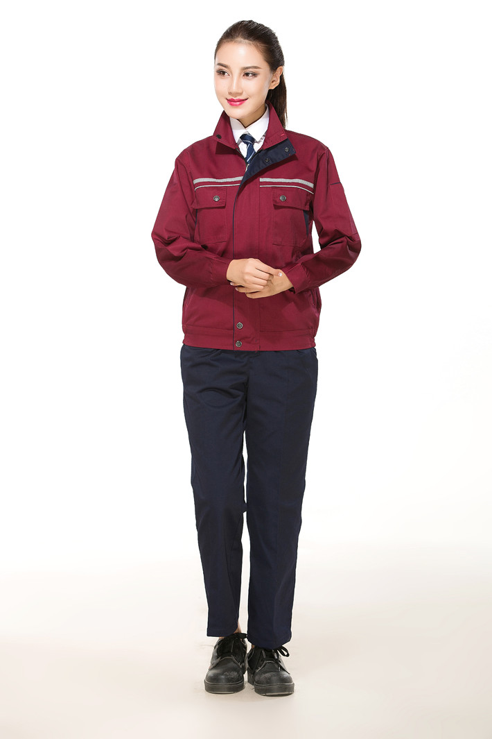 滌棉棗紅色立領(lǐng)拼色拉鏈?zhǔn)椒垂鈼l工作服長袖套裝GZ-FGT8028